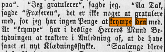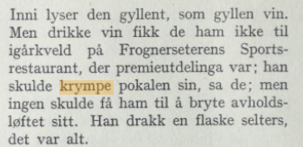 Reint grammatisk kan ein krympe både ei hending, ein vinst og den heldige personen. Tradisjonelt er det vanskeleg å koma utanom alkoholen når ein gjer det. Mikkjel Fønhus skriv i Skiløperen (1936):