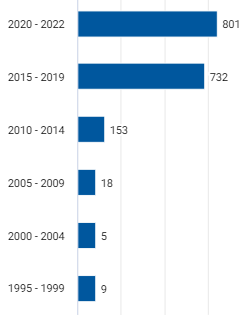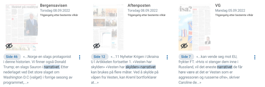 Nedenfor finner du bruksstatistikk, nærmere bestemt treff i artikler (nb.no) ved søk etter bestemt form «narrativet». («Narrativen» kommer først på banen etter 2000.)