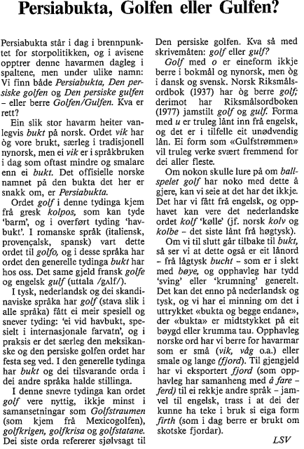 Hvis du vil studere utviklingen, kan du slå opp på ordnet.dk eller søke på nb.no. Prøv med «den persiske golf», «den meksikanske golf» og «golfen ved» og tilsvarende med «gulf» og «gulfen».
