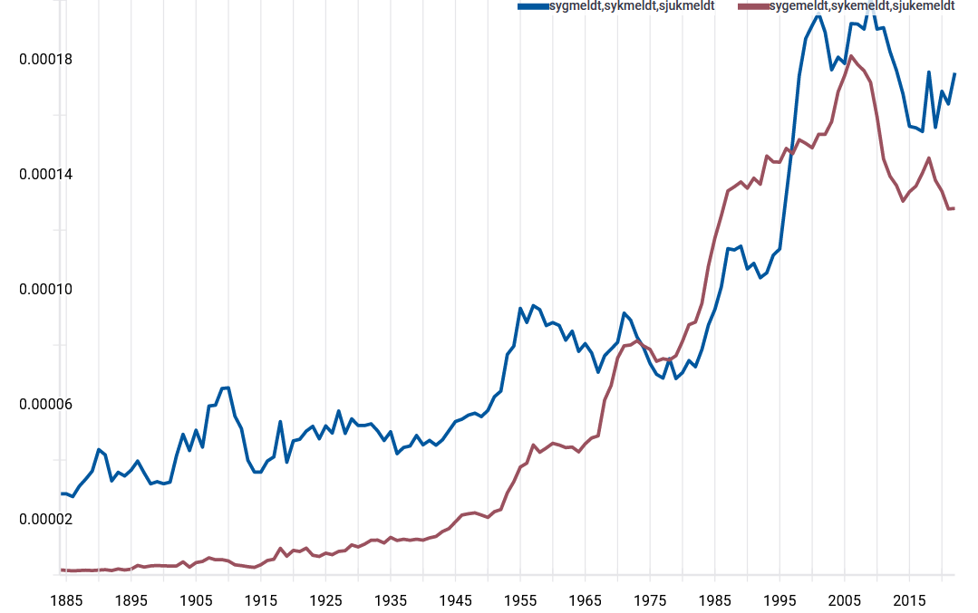Slik ser utviklinga ut i eit korpus hjå Nasjonalbiblioteket: