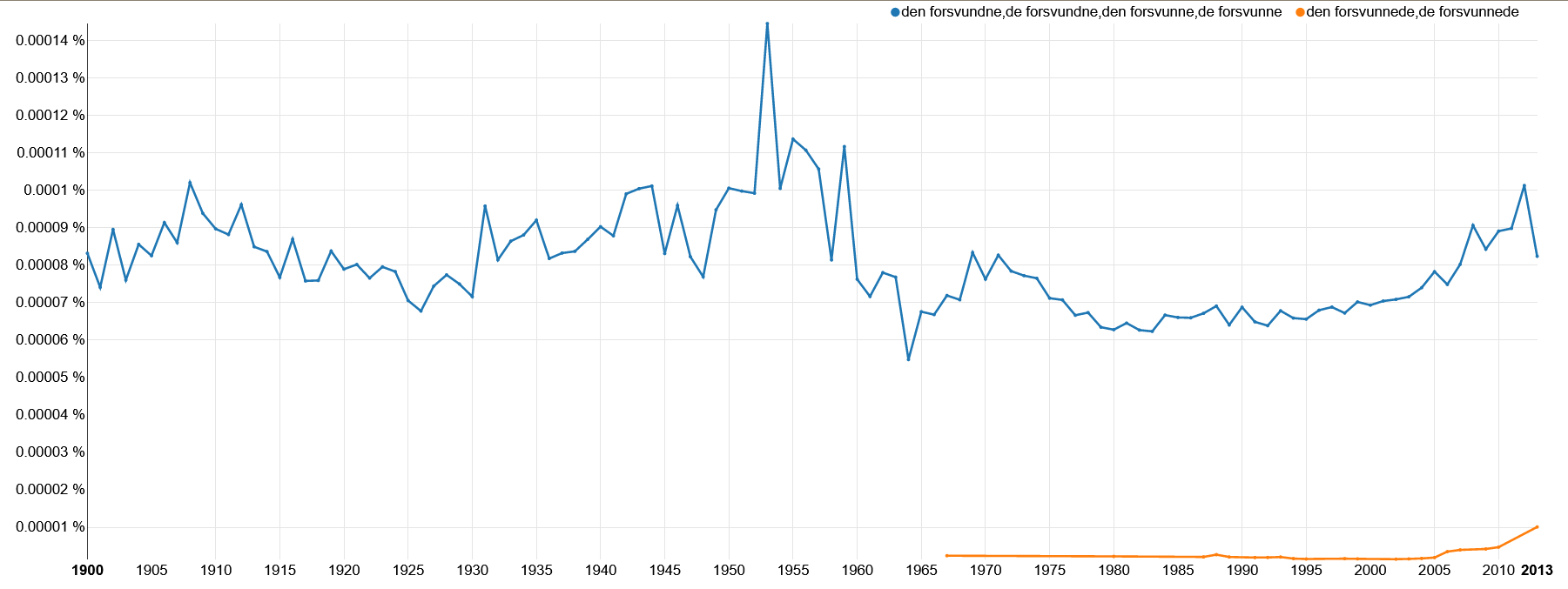 (Vi må sløyfe den ene n-en for ikke å få tre på rad. I gamle dager ville det ha hett fundne gjenstander fordi funnet het fundet.)