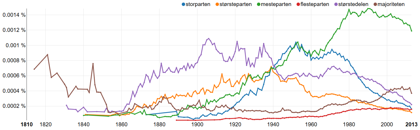 Et søk i bokkilder på nb.no viser hvordan storparten, som kanskje var det vanligste i norsk talemål, brøyter seg fram forbi synonymene med største- fram mot midten av århundret, men taper terreng igjen fra 1960-åra, da mesteparten tar over i mer eller mindre samme betydning.