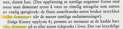 Så til «våte drømmer», eller «våte draumar», som det må heite på nynorsk: Uttrykket «wet dreams» er notert på engelsk alt i 1920-åra. Denne uttrykksmåten har opphavleg klåre seksuelle undertonar. Det kan vere greitt å vite før ein slår om seg med uttrykket. Som det står i boka Våre drømmer (no. utg. Cappelen 1963):