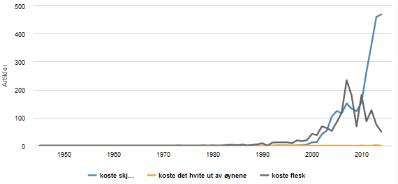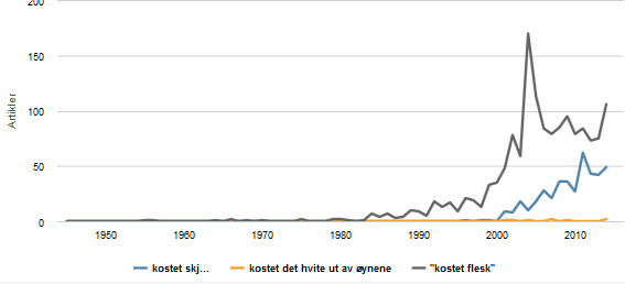 Etter som flesk (særlig kjøpt i Sverige) er blitt relativt rimeligere for folk flest, er det blitt et dårligere symbol på det dyre. Men klær er også blitt billigere, så skjorta er ikke en opplagt avløser for flesket. Likevel det er ingen tvil om at det er skjorte-uttrykket som sprer seg mest i norsk for tida. Her ser vi utviklingen i avisspråket: