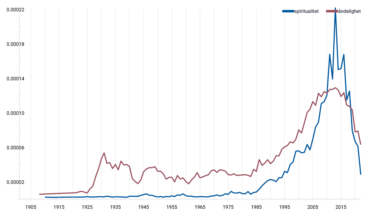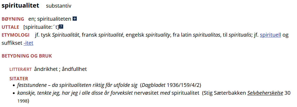 I den historiske Ordbog over det danske Sprog finnes riktignok spor av bredspektret spiritualitet som dekker det meste: ‘det at være af åndig natur; åndeligt liv; åndrighed’. Adjektivet spirituell har også kunnet dekke alt dette: ‘fuld af, præget af aand, vid; aandfuld; aandrig; vittig’.