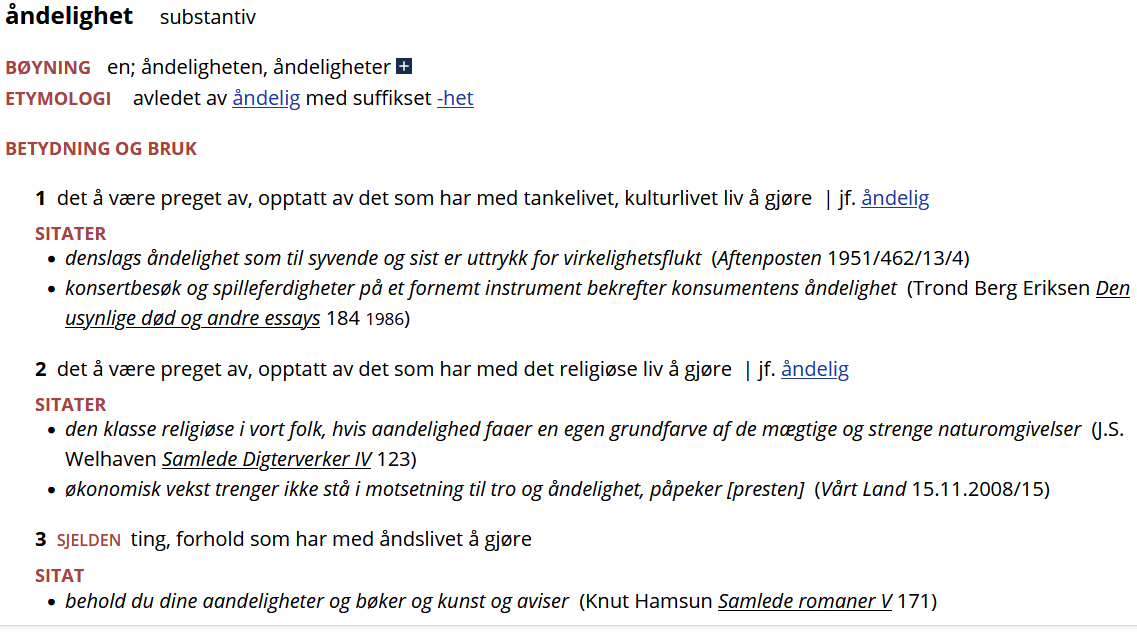 Dette har vært de viktigste betydningene av åndelig i allmennspråket, og åndelighet har vært det tilhørende substantivet. Åndelighet står ikke i Bokmålsordboka, men det står i NAOB: